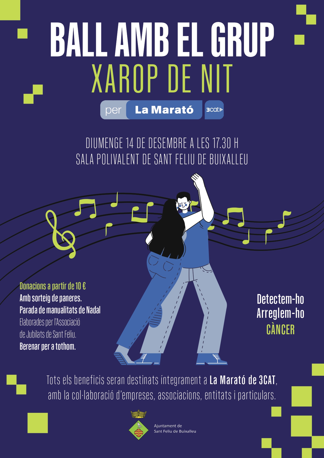 Ball amb el grup: Xarop de Nit Detectem-ho. Arreglem-ho Diumenge 14 de desembre a les 17.30 hores Sala Polivalent Donacions a partir de 10 € Tots els beneficis seran destinats íntegrament a La Marató de 3CAT, amb la col·laboració d’empreses, associacions, entitats i particulars.