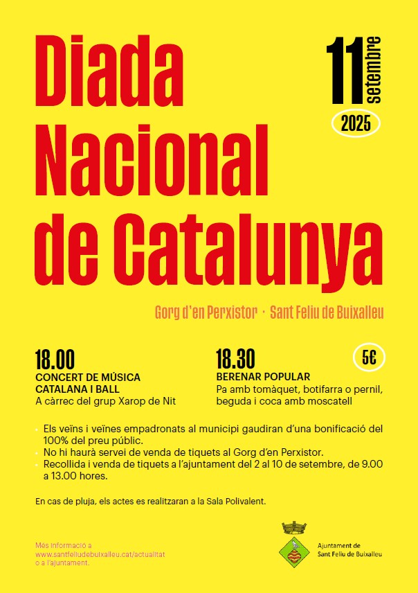 Actualitat Actes per la Diada Nacional de Catalunya 11/09/2025 | Gorg d'en Perxistor Consulta el programa de la Diada i els preus públics. Anunci preus públics Programa de la Diada < Entrada AnteriorEntrada Posterior >